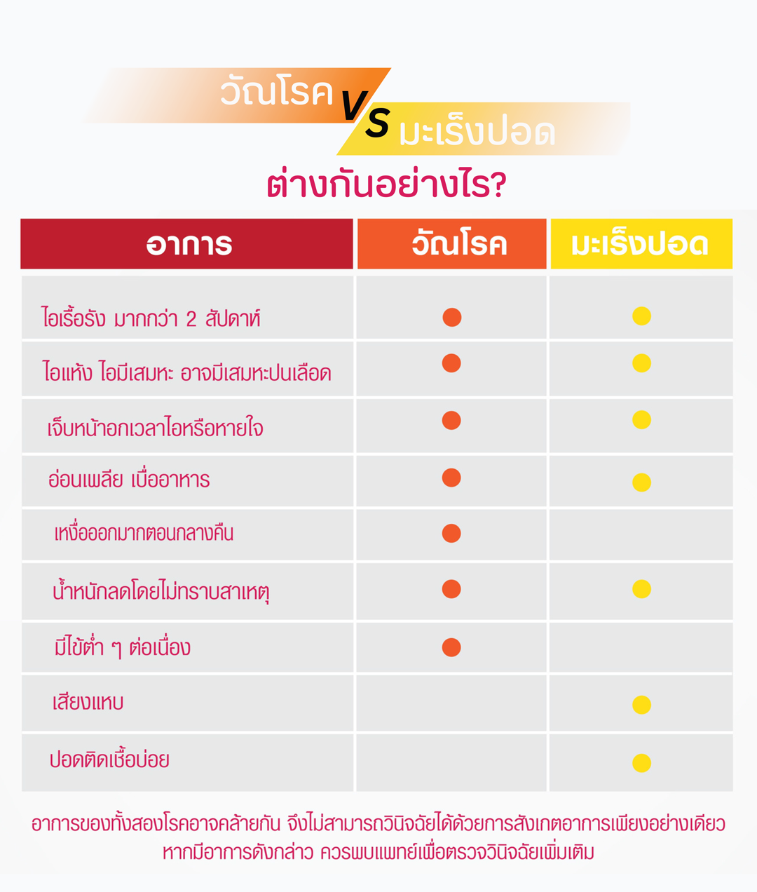วัณโรคปอด และ มะเร็งปอด เป็นโรคของระบบทางเดินหายใจที่อาจมีอาการเริ่มต้นคล้ายกัน การสังเกตอาการผิดปกติของร่างกาย และเข้ารับการตรวจตั้งแต่ระยะเริ่มต้น จะช่วยให้สามารถค้นพบโรคได้เร็วขึ้น เพิ่มโอกาสในการรักษา และลดภาวะแทรกซ้อนที่อาจเกิดขึ้นในอนาคต